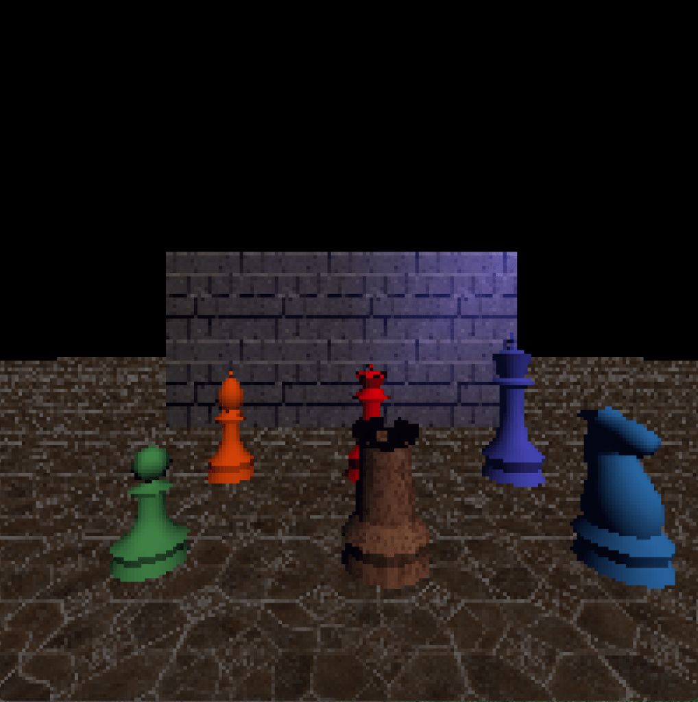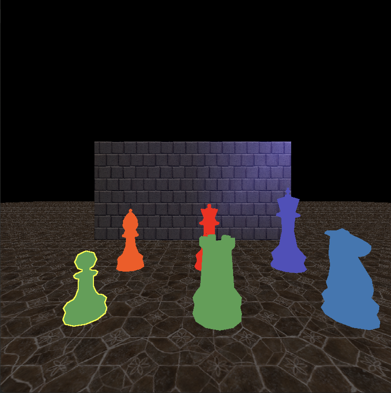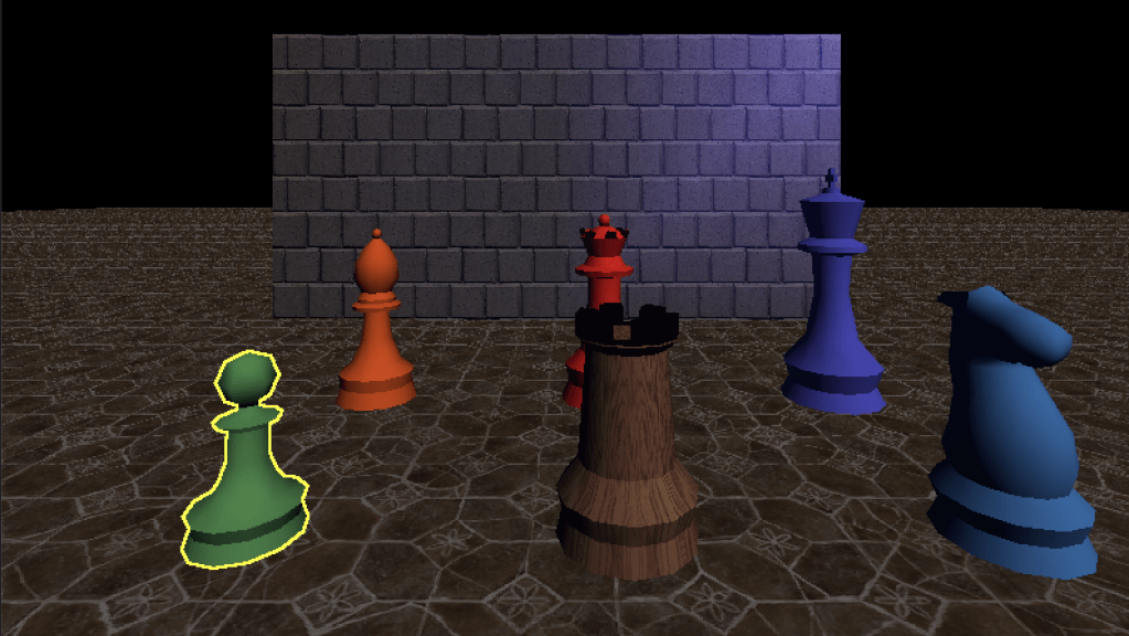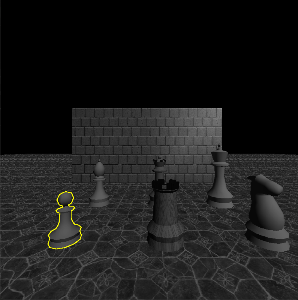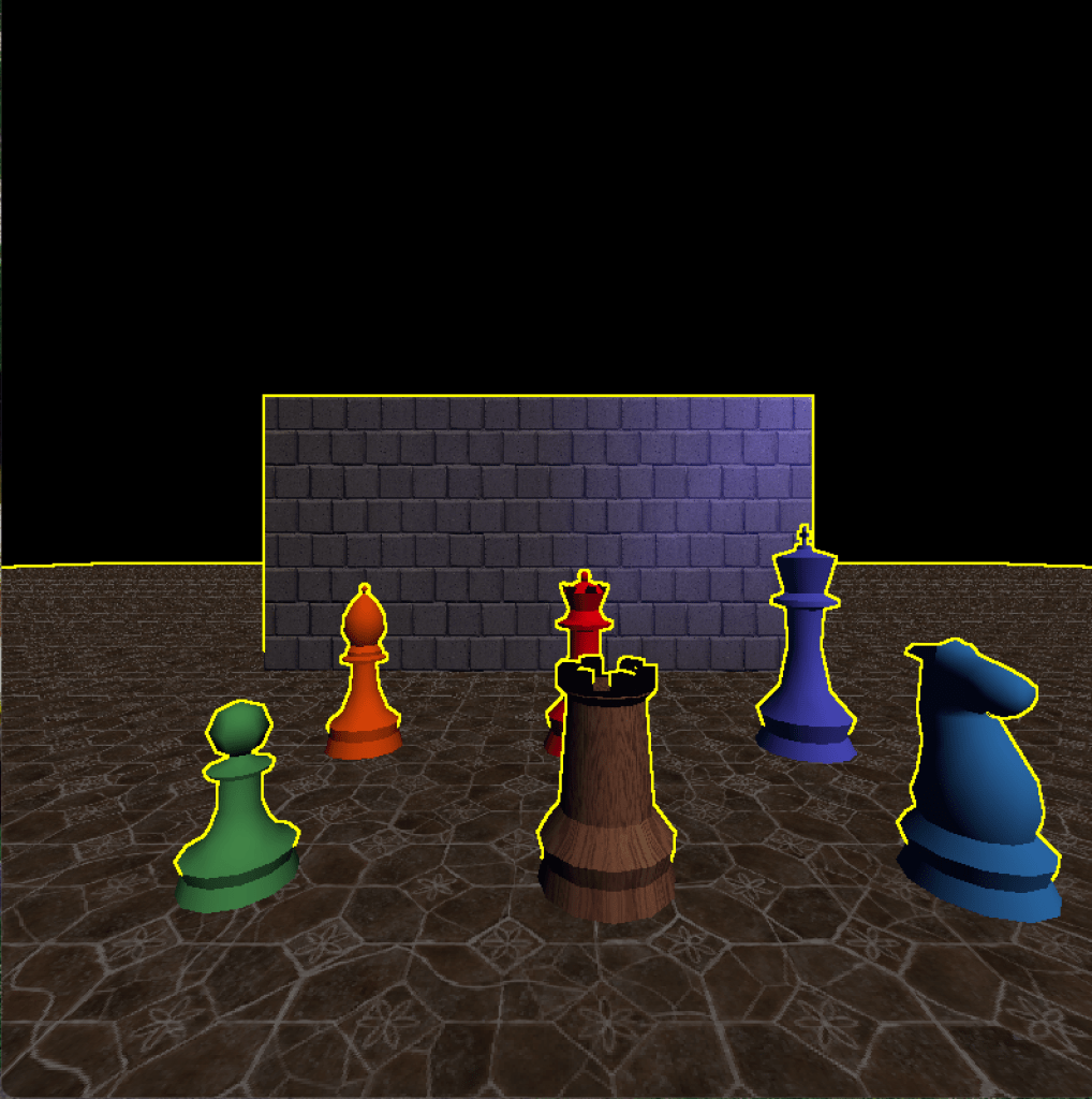 A limitation that you can see in this picture is that the front/bottom edge, where an object touches the floor, is not outlined. This is because the difference between the depth values is basically 0; they literally touch the floor, after all. One way we could fix that is to render the objects that we want to outline to a separate texture, like a z-buffer specifically for one or multiple objects. That way we would also have more control over which objects we want to outline, and we could even use it to outline objects behind walls where the standard z-buffer wouldn’t have any information about them since it contains the closest depth at that pixel. Modern games often render (parts of) the scene multiple times per frame, with different subsets of objects or materials and rendering different properties (colors, depth, lighting information, etc.), but at the cost of additional complexity and computation resources.