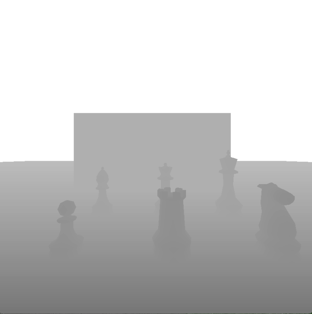 Although information about the 3D scene (meshes, polygons, world coordinates) is typically not available any more at the post-processing stage, things like the depth buffer are created in earlier rendering stages (we will look at how that works later on in the series) and are then made available for post-processing. Similar to the framebuffer, which contains the pixels of the rendered scene, the z-buffer is basically a grayscale texture where smaller values (black/dark gray) represent closer distances and higher values (white/light gray) represent further distances.